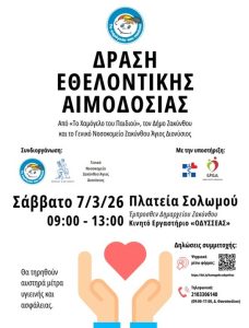 Το Σάββατο 7 Μαρτίου 2026, από τις 09:00 έως τις 13:00, στην Πλατεία Σολωμού (έμπροσθεν Δημαρχείου Ζακύνθου), θα πραγματοποιηθεί Δράση Εθελοντικής Αιμοδοσίας στο Κινητό Εργαστήριο «ΟΔΥΣΣΕΑΣ».